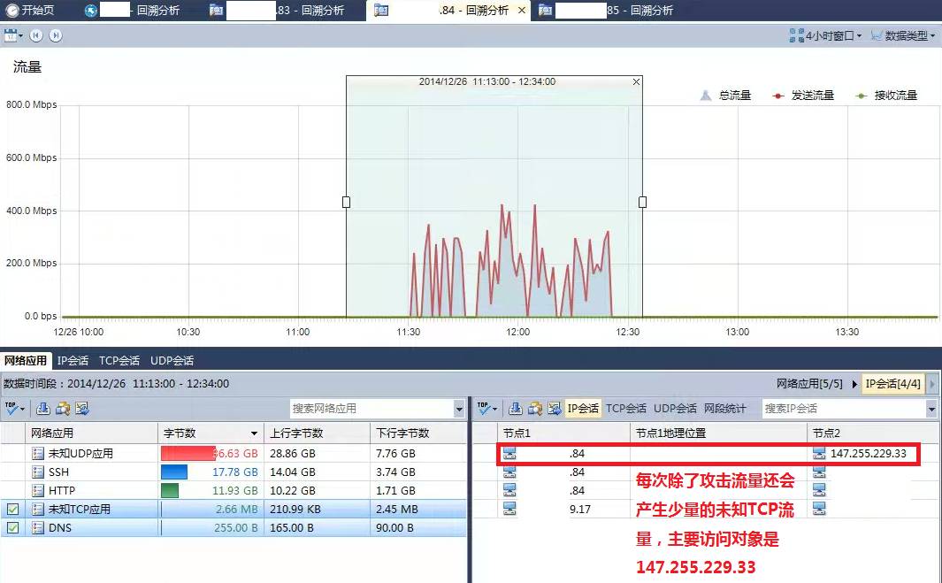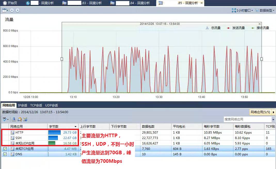 我们对2014年12月25日和26日几台出现问题的服务器流量进行分析。 问题服务器主要为*.83,*.84,*.85,上图为服务器*.85在不到一个小时内产生的流量,峰值流量为700Mbps,主要流量构成为HTTP,SSH,UDP,总流量达到70GB。