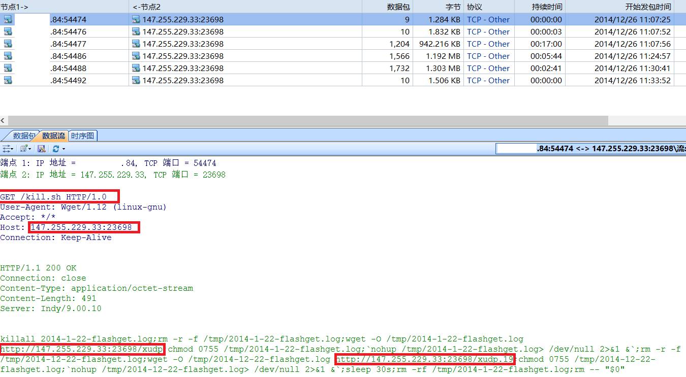 进一步分析发现,所有与147.255.229.33的通讯都是问题服务器主动发起的。第一个会话是问题服务器向147.255.229.33请求了一个kill.sh脚本。上图中可以看到该脚本的内容。其中会操作服务器下载xudp和xudp.19两个文件。