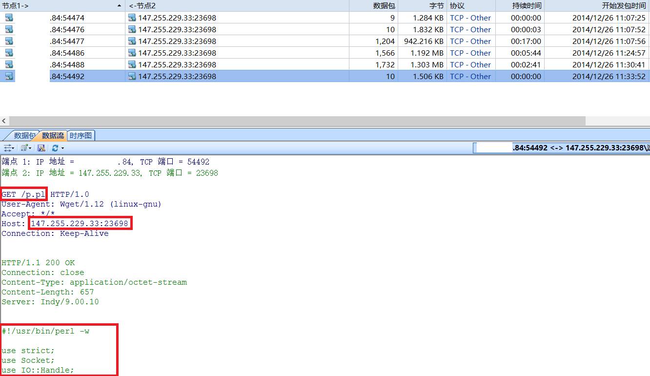 经过分析每次攻击前,问题服务器都主动从147.255.229.33下载这几个文件为攻击做准备。现在问题是服务器怎么会主动出现这些下载行为。