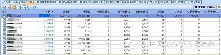 利用科来网络分析系统的端点分析视图和节点浏览器,针对性的对web服务器主机流量进行分析,确认其没有响应的原因。从下图可以看出,web服务器只有接收的数据包,没有发送数据包,ip会话和tcp会话数量非常大,同时全都是tcp同步接收。每秒数据包数近2000PPS,占整个网络中数据包数的绝大多数。同时每秒接收流量达到992Kbps,占据的99%的出口接收流量,是造成网络拥塞的主要原因。