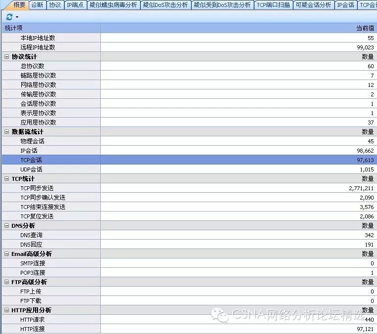 HTTP连接97121个,HTTP请求440个,也就是说绝大多数的HTTP连接中没有任何HTTP请求,明显异常。
