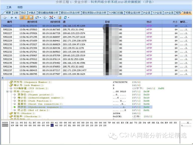 分析结论:tcp同步发送和同步确认数量明显异常,http连接数量远远大于http请求数量,这些异常很可能是由于攻击造成的。