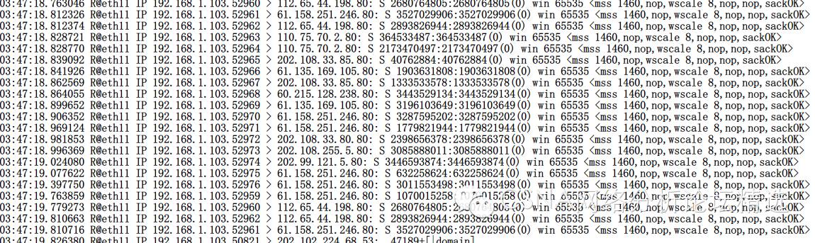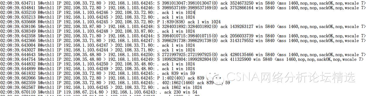 故障用户通过访问互联网,我们进行数据包的抓取。下图是在防火墙后端抓取的数据包: