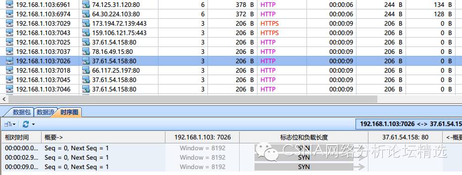 从上图可以看出,用户在访问Web页面时,主机向外网地址发送了TCP的SYN同步请求,但是没有外网地址对主机的SYN/ACK回应数据包,TCP会话的三次握手都没有建立成功,这导致了页面无法打开的故障现象。