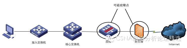 用户在访问互联网Web页面时,数据包只经过了交换机、流控和防火墙,由于用户在访问单位内部网页时都很正常,并且交换机并未对这些用户进行策略上的限制,只是进行单纯的数据转发。因此,我们定位出以下几个可疑故障点: