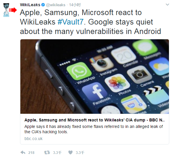 昨天,维基解密踢爆了美国中央情报局(CIA)可监听全球智能设备一事,面对这一大新闻科技公司们可是慌了手脚,因为如果不尽快修补用户隐私的防火墙,肯定会陷入一场巨大的公关危机。维基解密文档一发,许多公司就立即反应称会尽快修补漏洞,其他公司则表示在拿到详细信息后会尽快封堵漏洞,阻断攻击。