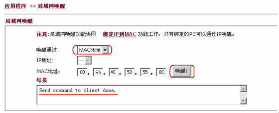 2.进入应用程序>>局域网唤醒页面。输入MAC地址,点击唤醒即可。