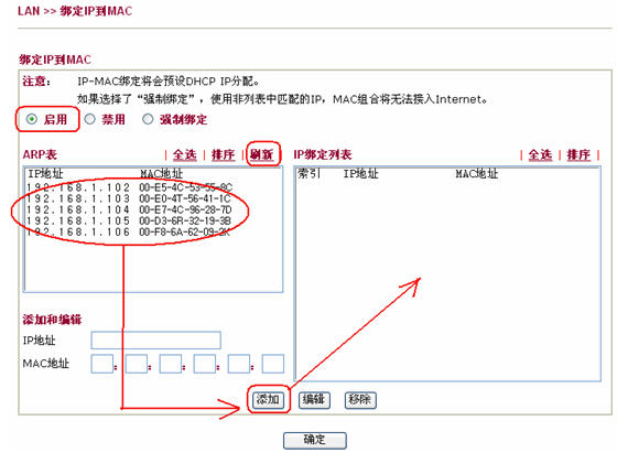 2. 选择ARP表中的IP地址,点击添加键把他们加入到右边的IP绑定列表。