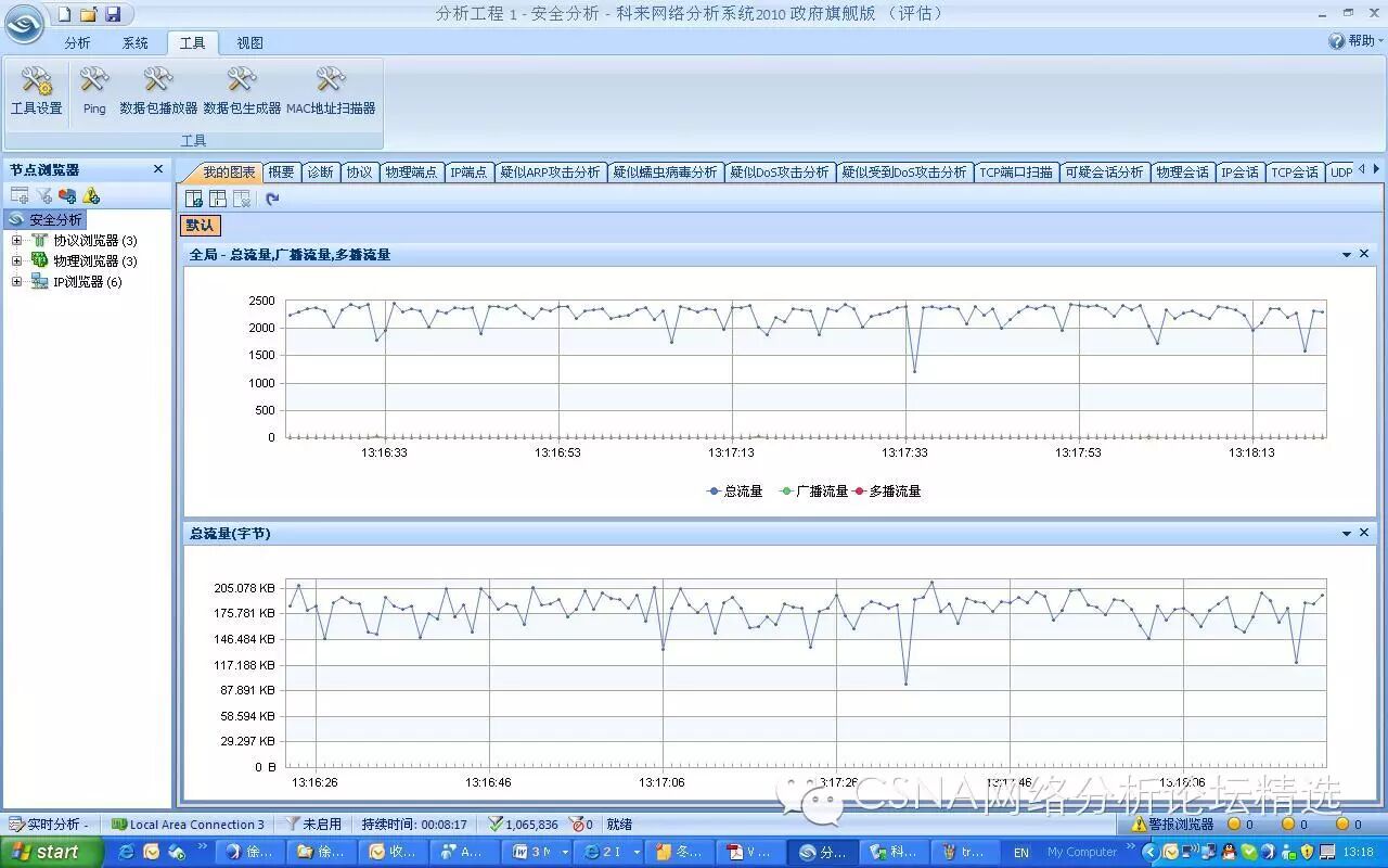 利用科来网络分析系统可以对网络中的总体通讯情况分析,包括主机数量、会话数量、应用请求数量的分析,查看是否存在异常现象。分析结果如下: