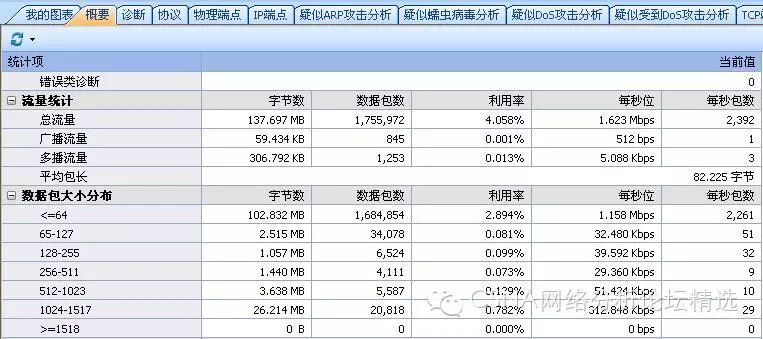 网络中的数据包率为2392PPS。计算出的平均包长为82bytes左右,平均包长很小,明显有异常现象。从包大小分布中我们可以看出,网络中小包(<64Bytes)数量为2261PPS,占绝大多数,比较异常。
