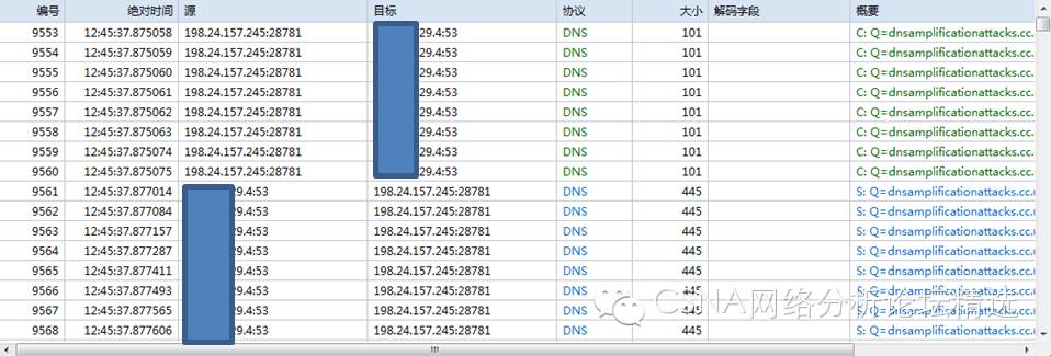 198.24.157.245发出的请求包为101字节,DNS服务器返回的应答包为445字节,从而使通信流量放大了4.4倍。
