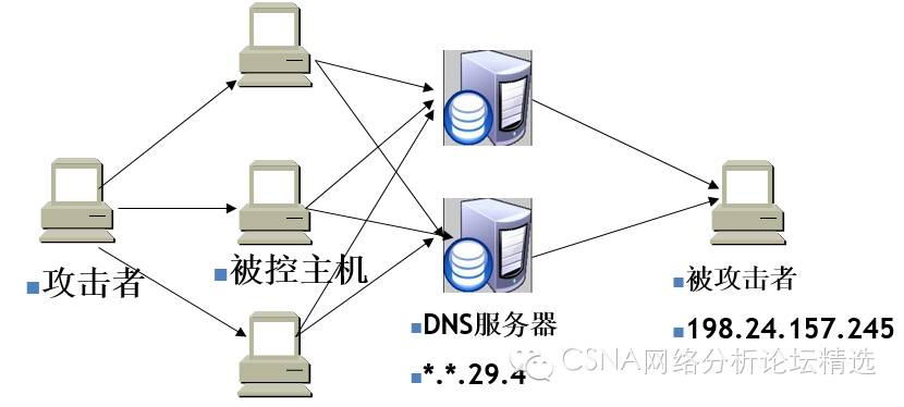 攻击者利用大量被控主机向大量的DNS服务器发送DNS请求,但请求中的源IP地址被伪造成被攻击者的IP(在本例中为198.24.157.245),于是DNS服务器会向被攻击者返回查询结果,通常查询应答包会比查询请求包大数倍甚至数十倍(在本例中为4.4倍),攻击者由此将攻击效果扩大了若干倍。从而形成对198.24.157.245地址的流量放大攻击。
