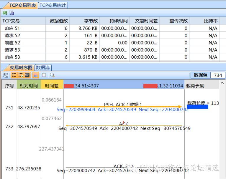 也有情况如下图,三次握手结束后,客户端发出请求命令,大约0.039秒后收到来自服务器的ACK回复,表示该命令服务器已收到。但过了12.05秒后服务器才开始传输客户端请求的数据,这段时间主要是服务器对该操作命令的响应时间。因此在该会话中服务器响应时间为主要的延时构成。