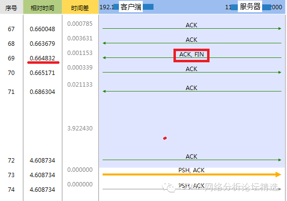 有效数据传输时间:通过科来软件看到服务器传完数据,发出“FIN”信号的时间