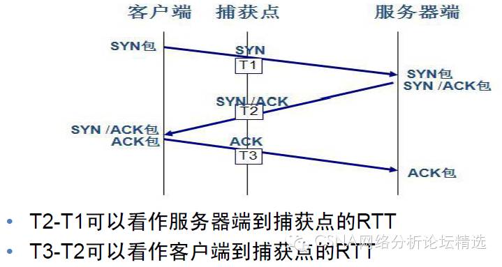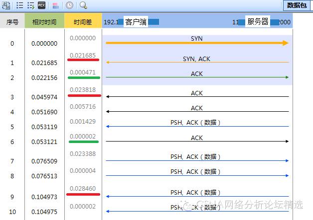 科来网络分析系统捕获到每一个数据包都会打上时间戳,而系统在处理三次握手的时候,由于不含应用层的信息,所以T2-T1可以近似为服务器端网路时延,T3-T2可以近似为客户端网络时延,正常情况,(服务器端网络时延+客户端网络时延)与彼此ping的时延相近。